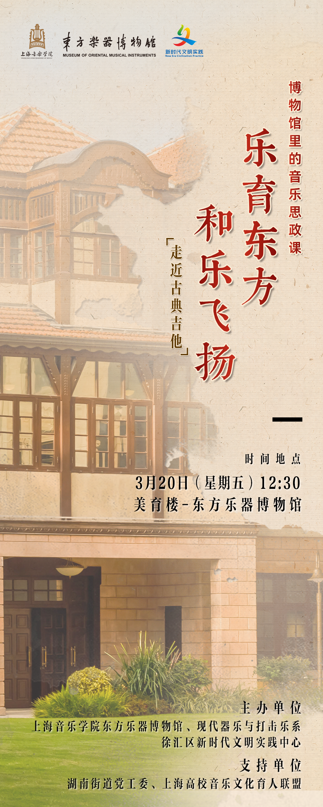2026年3月20日(星期五)12:30,相约上海音乐学院东方乐器博物馆(淮海中路1209号美育楼),在古典吉他的温润乐声里,聆听时代旋律,感悟美育力量,共赴一场音乐与思政的美好相遇。