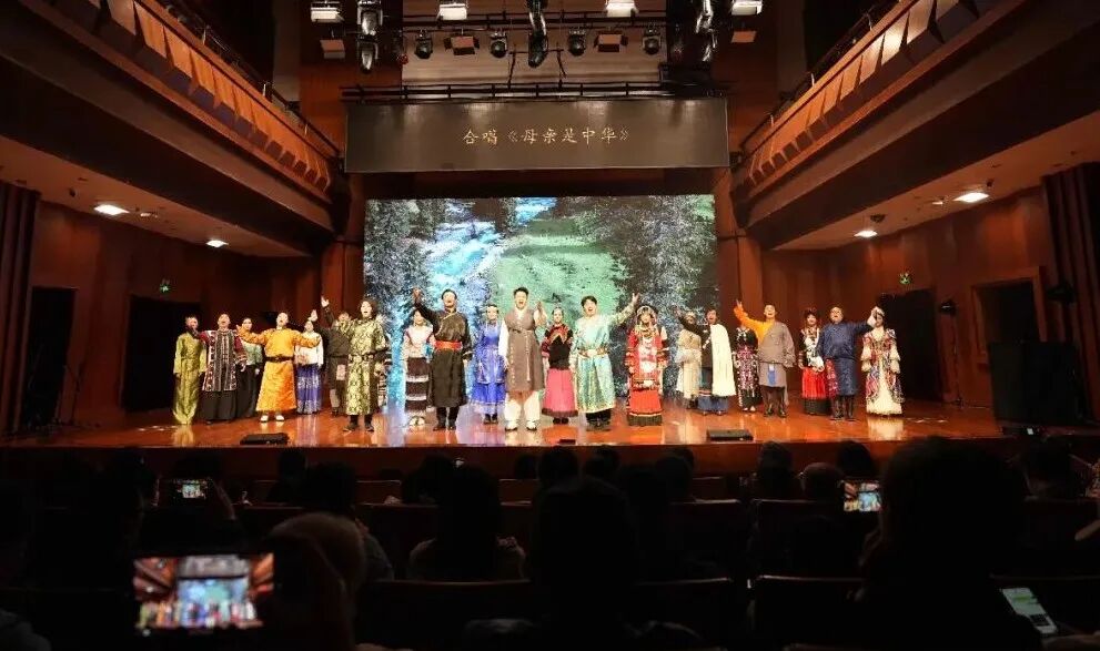 音乐会后半程,《北京的金山上》《崴萨啰》《酒歌》等歌曲联唱轮番上演,各民族欢歌热舞接连呈现,现场气氛热烈非凡。全体演员与观众齐声合唱《母亲是中华》,将音乐会推向情感高潮,“五十六个民族亲如一家,就像百花园里盛开的花”的铿锵旋律,唱出了各民族儿女对祖国母亲的赤诚热爱,诠释了各民族像石榴籽一样紧紧抱在一起的紧密联结,让铸牢中华民族共同体意识的理念在歌声中深深扎根。
