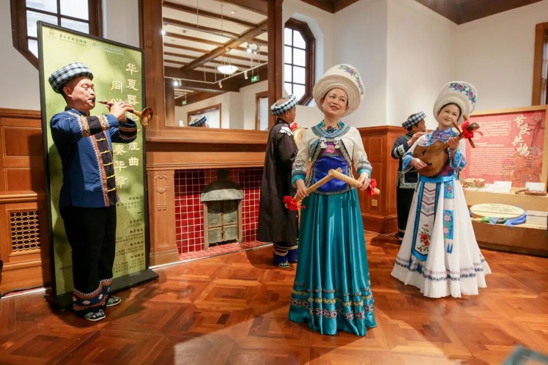 当天中午,尽管阴雨绵绵,本场演出也以“导赏+演奏”的形式,在上音东方乐器博物馆火热开展。作为第 41 届上海之春国际音乐节上音音乐开放周系列活动之一,本次沉浸式展演邀请了贵州黔西南州布依八音坐唱、西北果洛民族乐器弹唱、北方内蒙古呼麦等表演者齐聚一堂,为复旦附中徐汇分校、徐汇区第一中心小学的学生及众多上海市民,生动展现中华民族多元音乐文化的独特魅力。