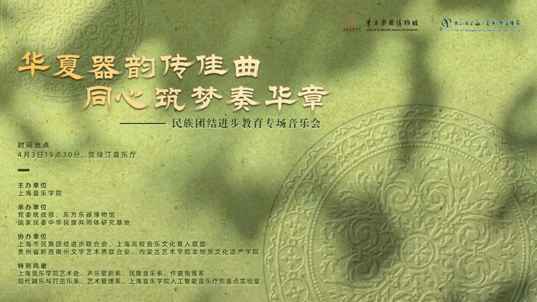 乐韵绕申城,同心筑华章。4月3日晚,由上海音乐学院主办的“华夏器韵传佳曲 同心筑梦奏华章——民族团结进步教育专场音乐会”在贺绿汀音乐厅圆满落幕。本场音乐会作为第41届上海之春国际音乐节系列活动之一,以音乐为媒、以艺术为桥,融汇多民族艺术精粹、贯通传统与创新表达,生动诠释“中华民族一家亲”的深厚情谊,为铸牢中华民族共同体意识注入鲜活的文化力量。