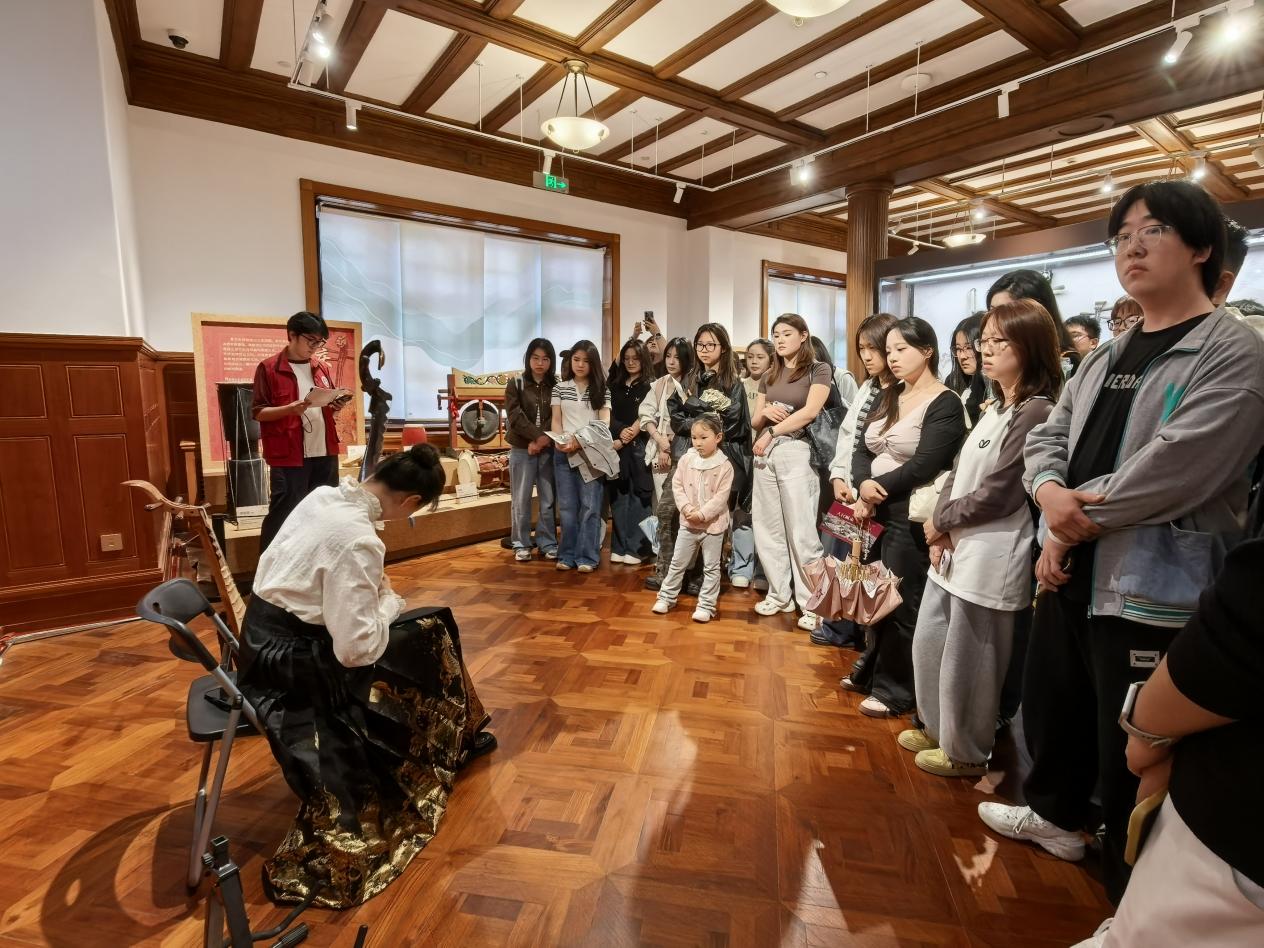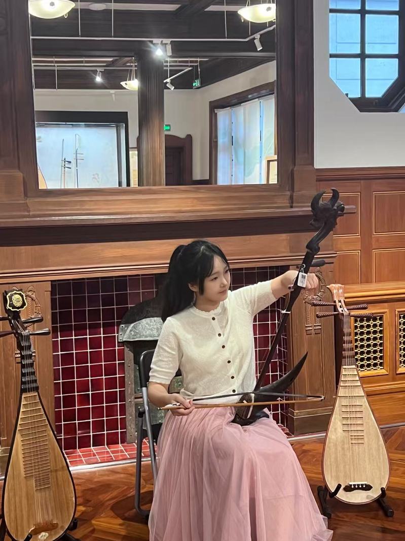 学生志愿者黄婧涵使用二胡奏响《我的祖国》,熟悉的旋律引发了在场师生的情感共鸣。而后,她执弓于另一件馆藏-西南地区牛角胡,演绎了《赛马》的欢快旋律。牛角胡与二胡同属“胡琴”家族,却因在不同文化土壤中“在地化”发展而各具风姿,完美诠释了中华音乐文化“各美其美,美美与共”的融合景象。