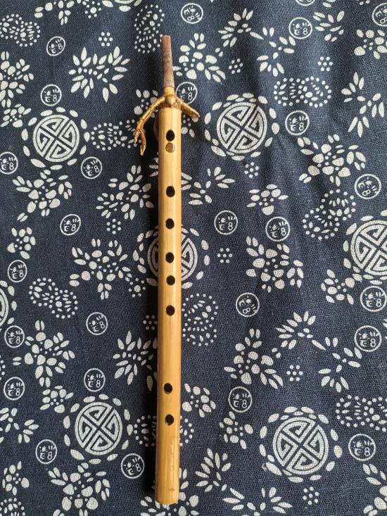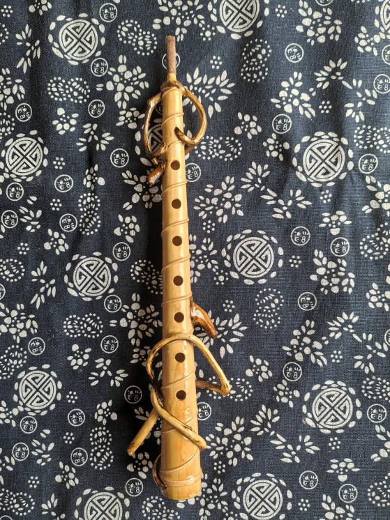 勒尤为布依特有木制双簧乐器,以泡桐木或花椒木制作,虫壳为簧,通长35cm,下口直径3.2cm,传统为5孔,此件为改良款,7孔,是布依民间音乐的标志性吹管乐器。