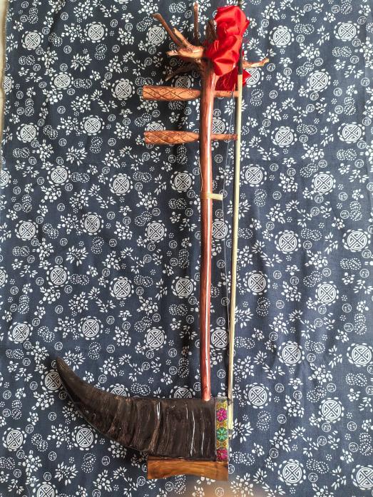 牛角胡属拉弦乐器,通长约86cm,角长33cm,角直径8cm,弦轸长17cm,蛇皮蒙面,五度定弦,音色圆润,在布依八音演奏中起主奏作用。