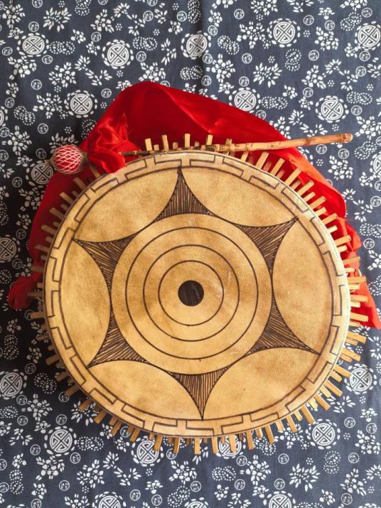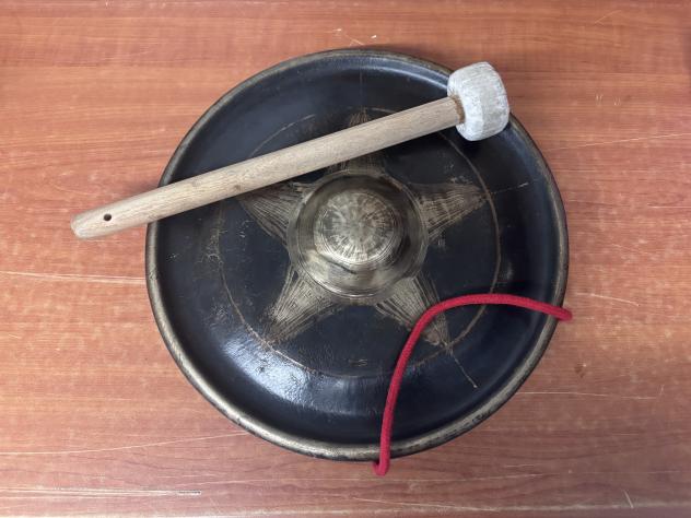 包包锣是布依八音坐唱铜质打击乐器,因锣面中心呈半球状包状突起而得名。包包锣呈圆盘形,中心突起,边缘略厚,常见外径约30厘米,亦有大小不同规格。此件直径30cm,系红绸带便于持握,以单根软头槌敲击,无固定音高,主要用于稳定乐队节奏,在八音坐唱中与刺鼓、小马锣、铜镲等配合,是乐队节奏骨干之一。