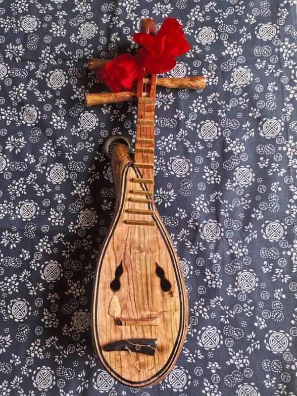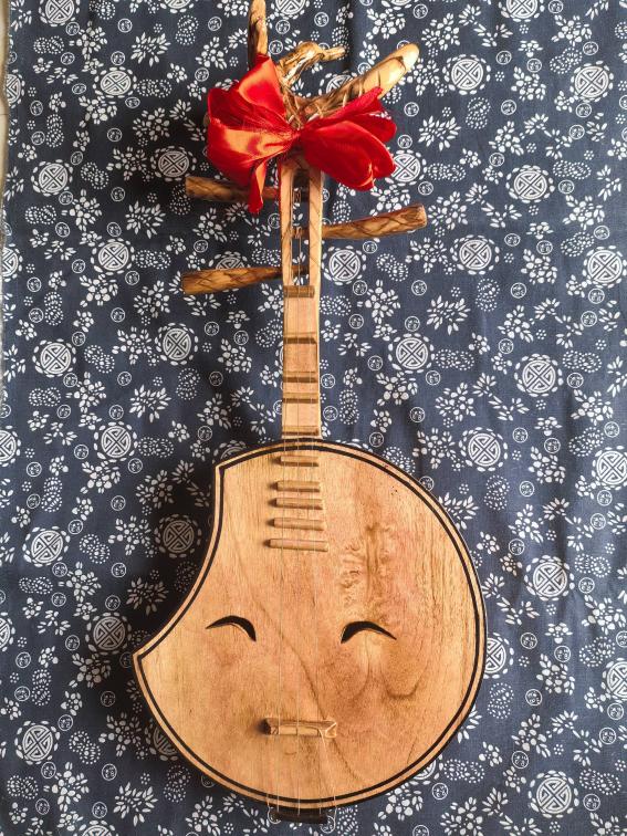 月琴为小月琴,通长约80cm,弧径35cm,琴腔厚6.5cm,金属弦3根,9品,牛角拨,为布依八音的重要弹拨乐器。