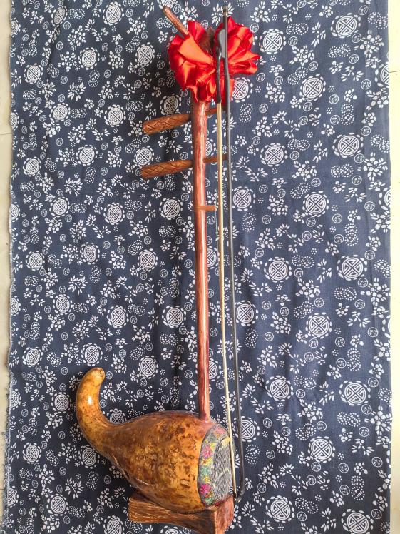 葫芦胡,布依语称“格当”,通长约87cm,葫芦长34cm,弦轸长17cm,蛇皮蒙面,五度定弦,以葫芦为共鸣筒,音色圆浑、略带沙沙声,是布依八音的主奏乐器之一。