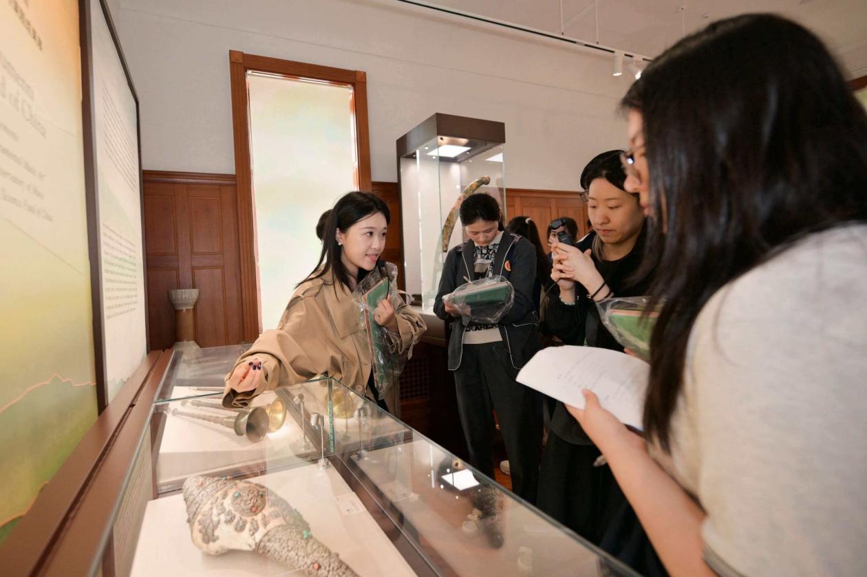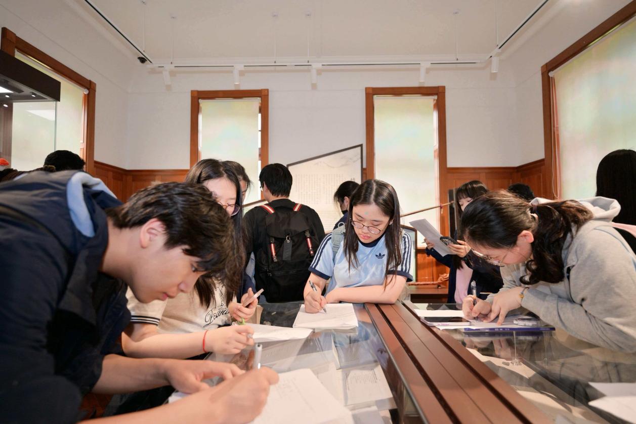 本次参观作为附中《中国音乐史》选修课的实践教学部分,为让实践学习更具针对性与实效性,课程教师黄艺鸥副教授提前为同学们发放了东方乐器博物馆参观学习问卷。参观过程中,围绕东方乐器的历史渊源、形制特征与文化内涵等,周洲对三大展厅进行了细致讲解。在互动环节中,周洲特别介绍了象脚鼓,并邀请同学们亲手敲击体验。同学们一边聆听讲解、记录要点,一边参与互动,在观察与体验中深化了对传统音乐文化的理解。
